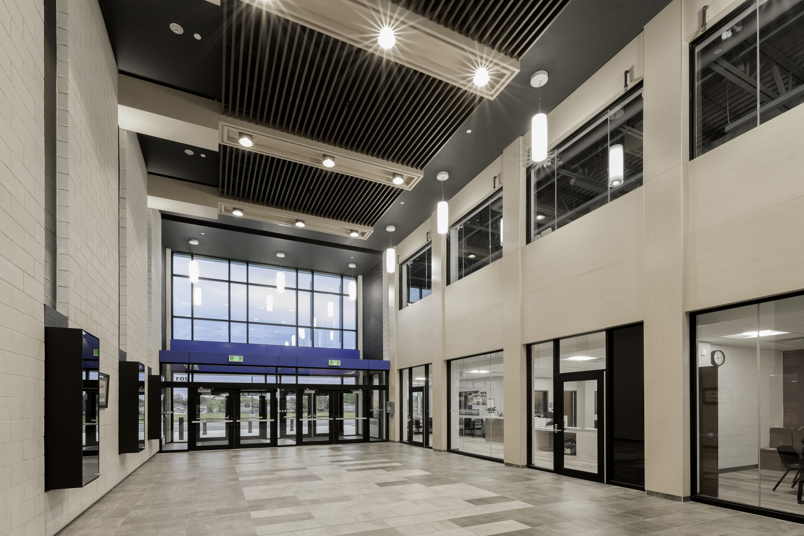 The double height entry space creates a clear identity for the building. The main entrance, lobby and gathering area are located at the midpoint of the main corridor with direct visual connection from the main entrance through the glass lobby and gathering area to all corridors on the main floor to the second floor. This is envisioned as the heart of the school.