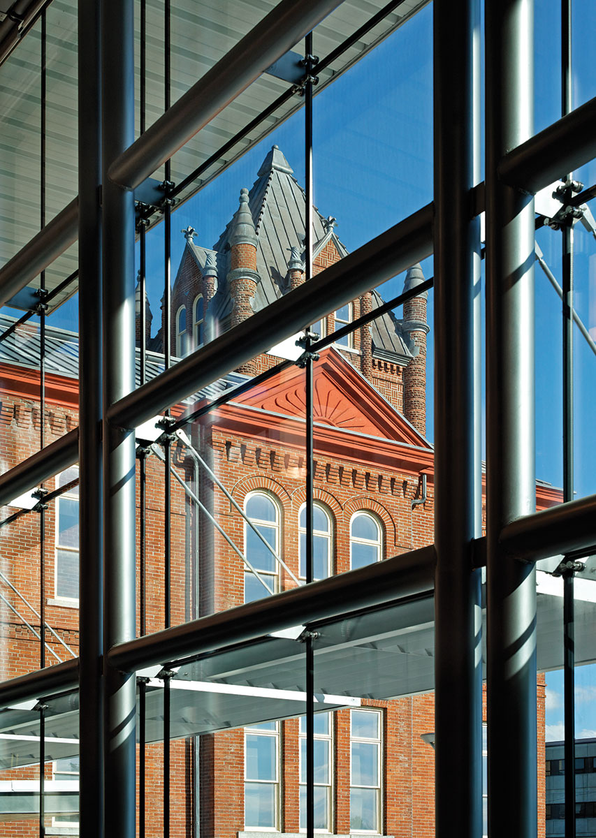 Central to this theme is the enhancement and formalization of the existing arrival to the building, through a transparent, transitional glass gateway. The structure of the Atrium is located in the current entrance to the historic building, as a significant expression of its activities and interests of its users. The gateway naturally flows out onto the public courtyard to form an invisible transition.