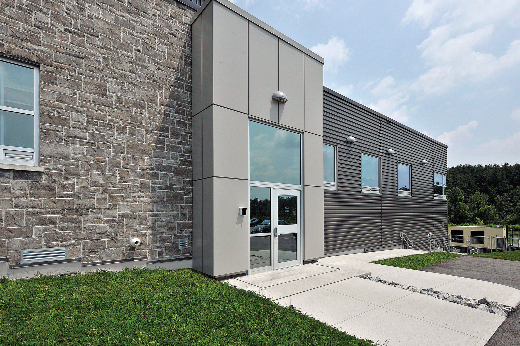The building was designed and located to be highly visible and accessible from Innis Lake Road. The building is clad in natural stone and ribbed steel siding offering a sense of permanence and stability. The building program includes a community meeting room adjacent to the main public entrance for various public outreach programs and information sessions for the public.